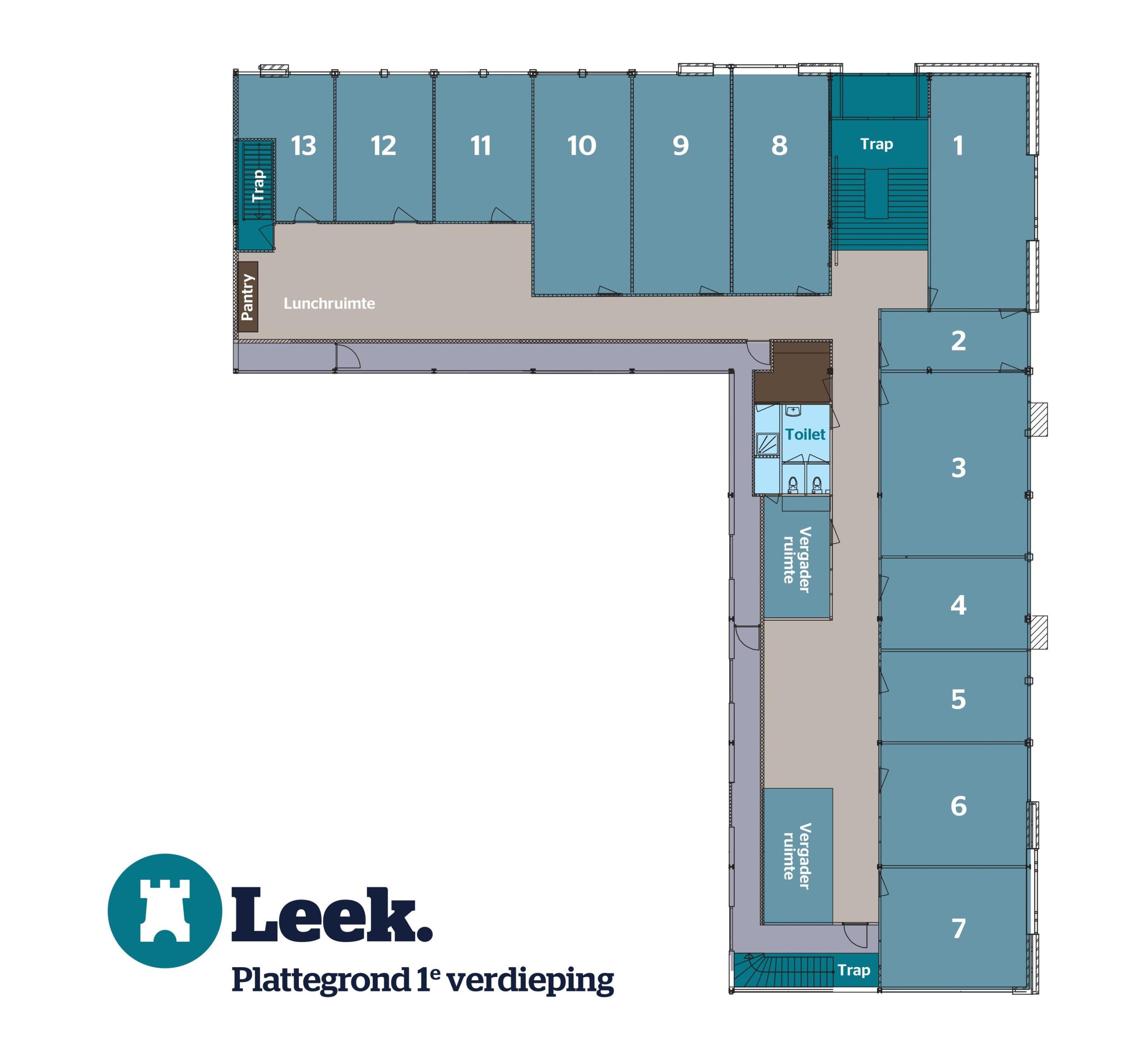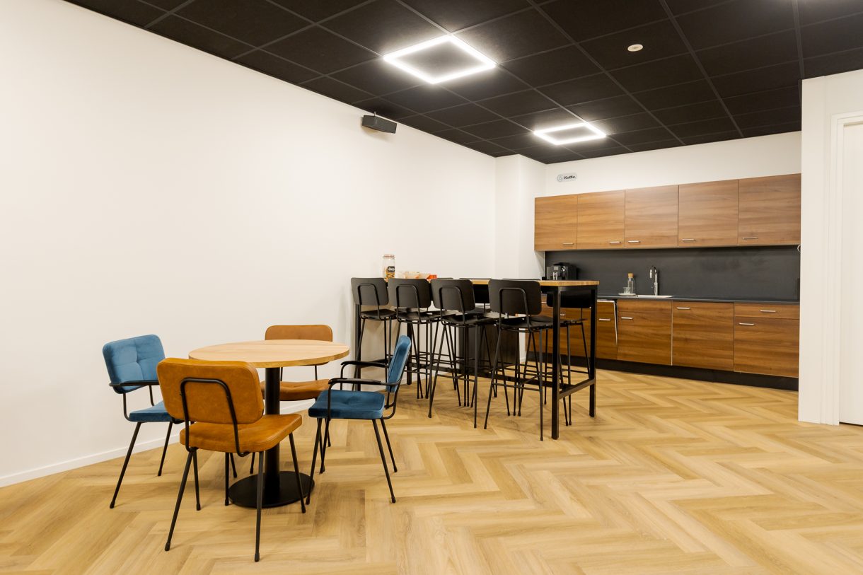 Op de 1e verdieping vind je de etage waar diverse (lokale) bedrijven zijn gevestigd. De kantoren delen een aantal gemeenschappelijke voorzieningen, zoals de keuken, toiletten en vergaderruimtes.
