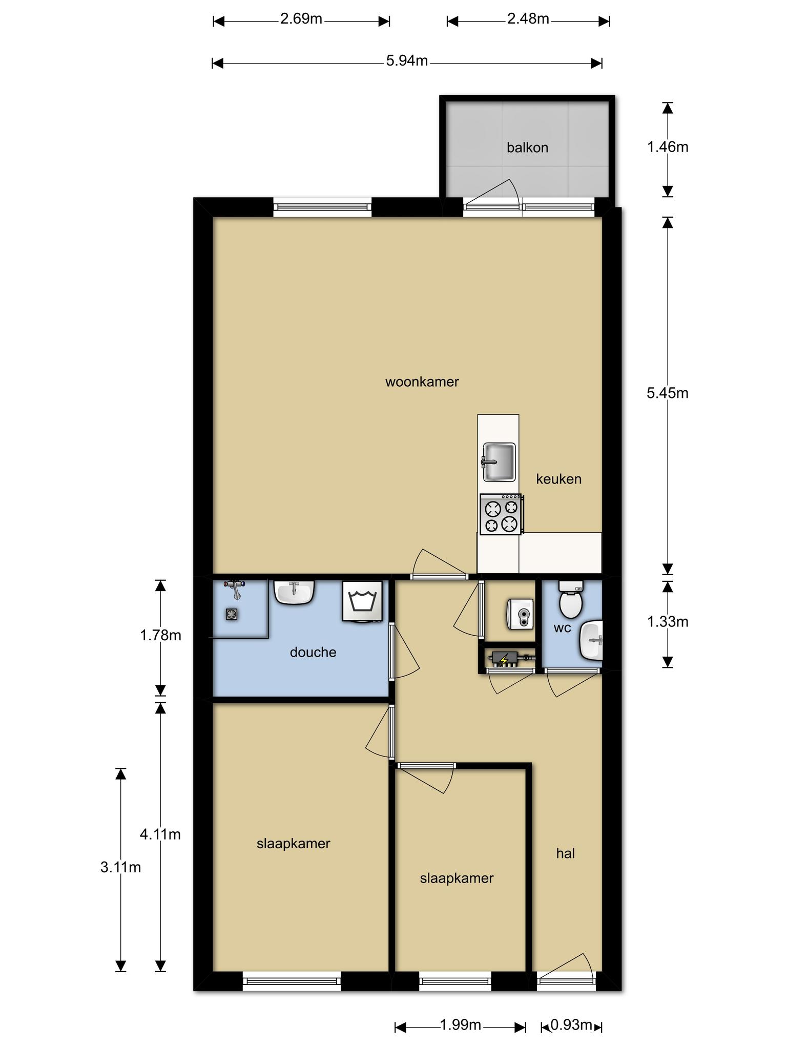 Hal met meterkast, toilet met fonteintje, kast met c.v.-opstelling en mechanische ventilatie, ruime woonkamer met toegang tot het balkon, semi-open keuken voorzien van nette keukeninrichting, voldoende kastruimte en enig inbouwapparatuur. De woonkamer en keuken zijn samen ca. 32 m² groot. Verder zijn er 2 slaapkamers van ca. 11 en 6 m² en een badkamer met douche, wastafel en wasmachine aansluiting.