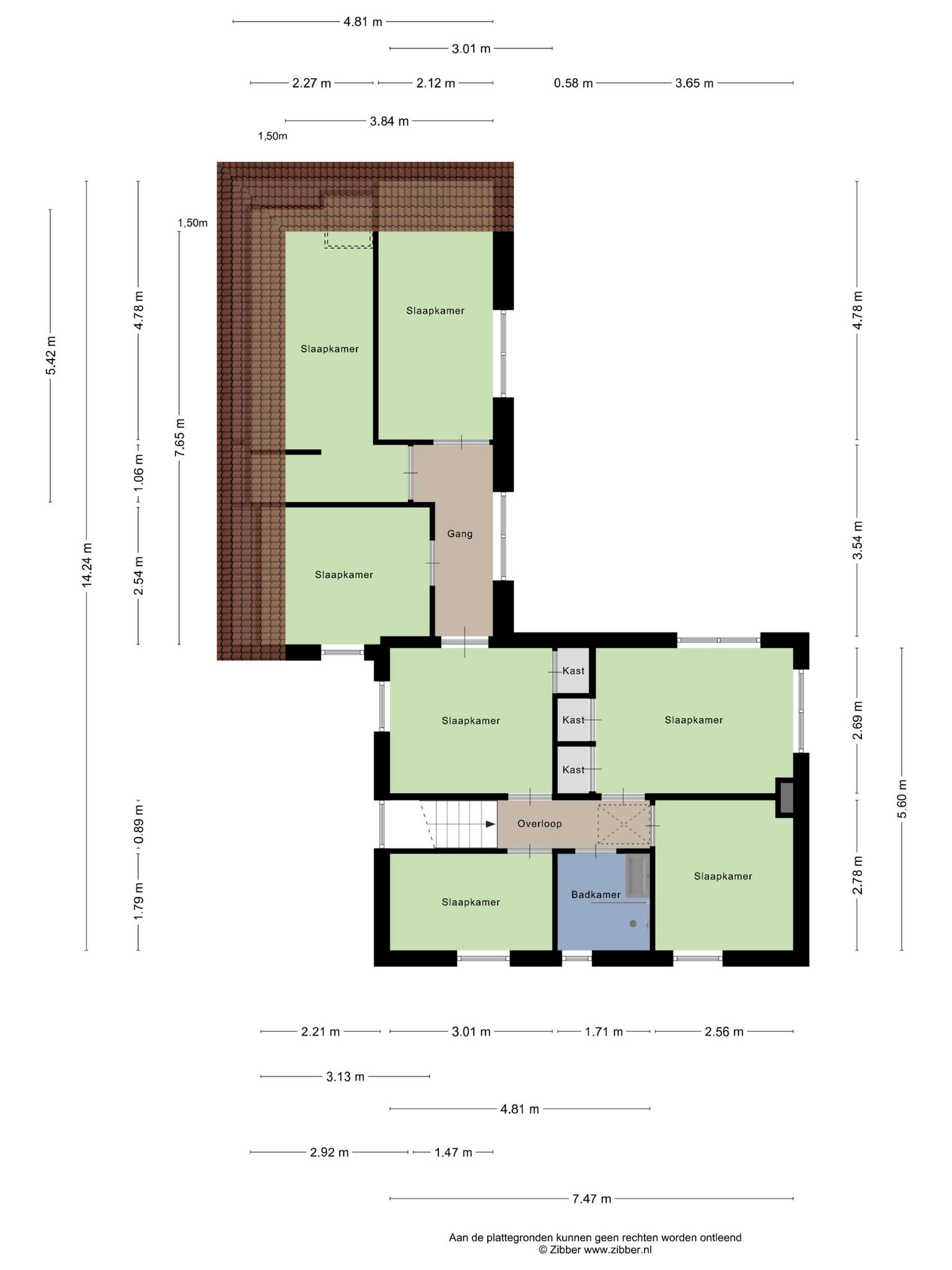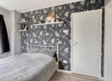 Overloop, 4 slaapkamers van ca. 5, 7, 8 en 10 m² in het voorhuis, waarvan twee met vaste kasten en een nette badkamer voorzien van wastafelmeubel en inloopdouche. Op de aanbouw vind je een gang met 3 extra slaapkamers van allen ca. 8 m².