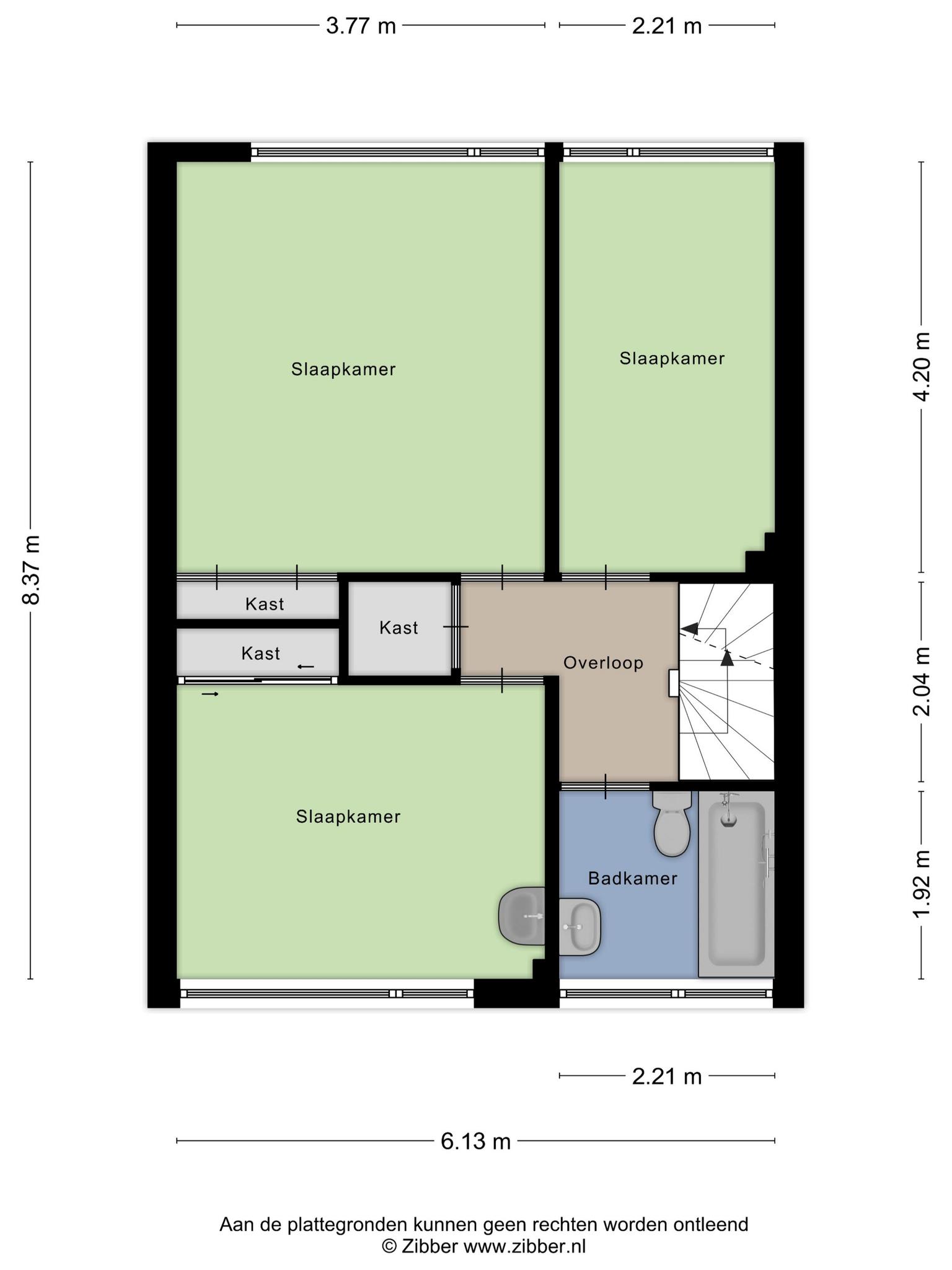 Overloop met inloopkast, 3 slaapkamers van ca. 9, 12 en 16 m² welke allen zijn voorzien van kunststof kozijnen en 2 van vaste kasten, en een badkamer met ligbad/douche, wastafel en 2e toilet.