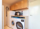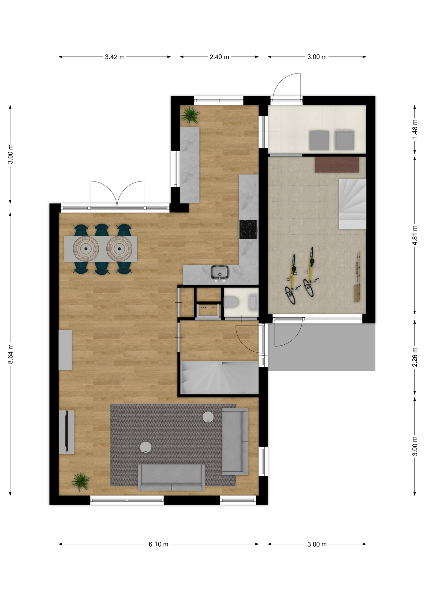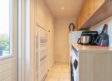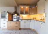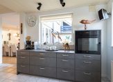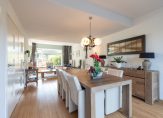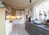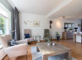 Via het overdekt zij-entree kom je in de hal met garderoberuimte, net toilet met fontein en deur naar de royale woonkamer van ca. 39 m². De grote ramen aan de voorzijde en de openslaande deuren aan de achterzijde zorgen voor veel daglicht. De keuken van ca. 13 m² is ruim opgezet (ca. 13 m²) met nette kastinrichting en inbouwapparatuur zoals een inductiekookplaat (2022) met afzuigkap, vaatwasser, koelkast, combimagnetron, oven (2022) en granieten aanrechtblad. Grenzend aan de keuken vind je de bijkeuken met witgoedaansluitingen, deur naar de tuin en deur naar de garage/berging met vaste trap naar de werkkamer/kantoorruimte en bergruimte.