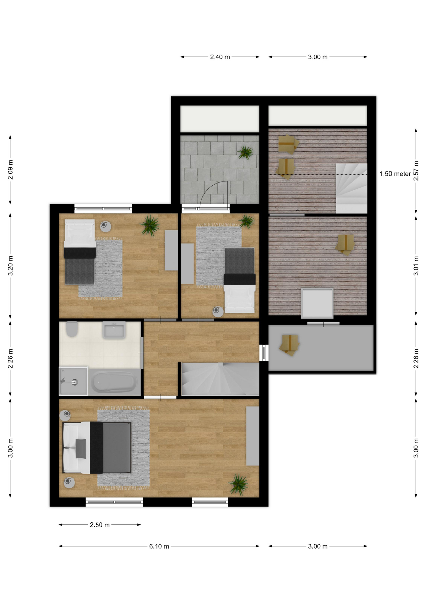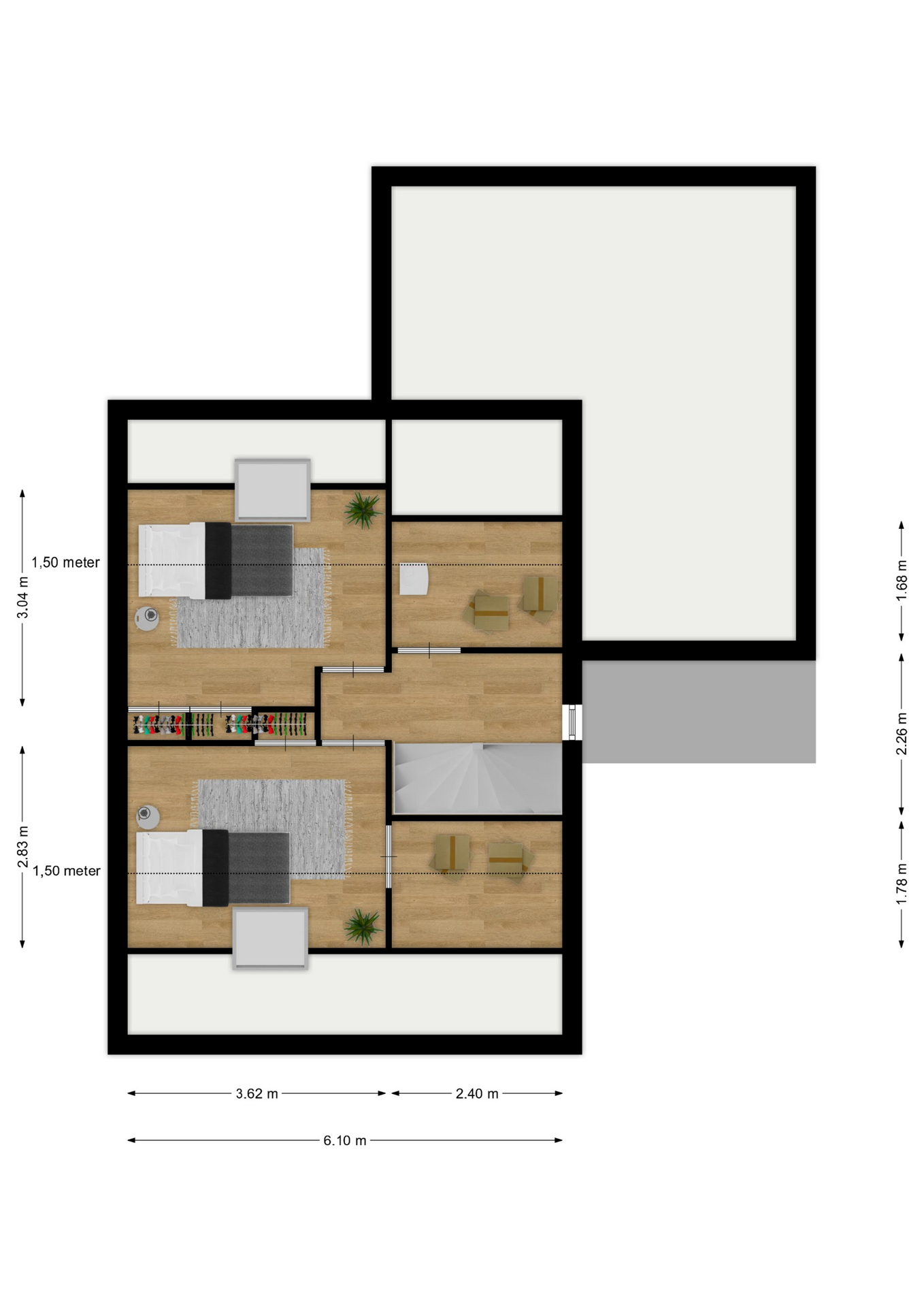 Ook op de tweede verdieping is er volop ruimte. Via een vaste trap kom je op de overloop, die leidt naar nog eens twee slaapkamers van ca. 7 en 6 m², beiden voorzien van een dakraam en vaste kastenwand. Daarnaast vind je hier extra bergruimte en de CV-ruimte.