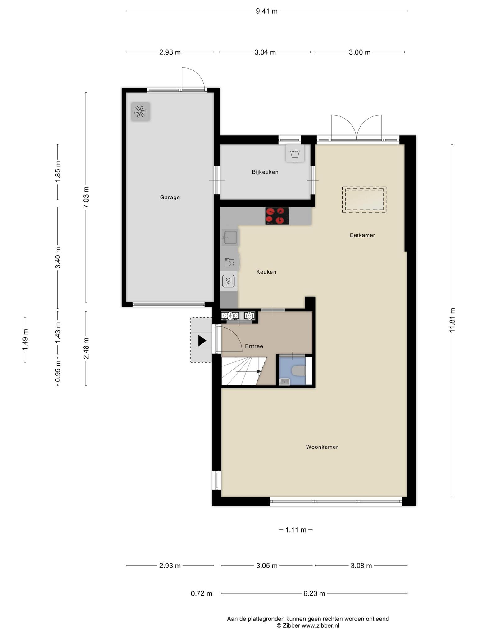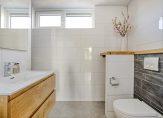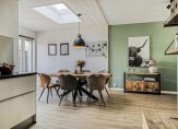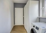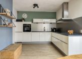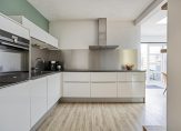 Entree/hal met meterkast, modern toilet en garderoberuimte. Toegang tot de royale woonkamer van ca. 32 m² met een prachtige cinewall en sfeerhaard als blikvanger. Dankzij de vele raampartijen is dit een heerlijk lichte leefruimte. Centraal in de woning is de moderne woonkeuken van ca. 27 m². De keuken is uitgerust met inbouwapparatuur: combi-oven, vaatwasser, inductiekookplaat met afzuigkap en koelkast. Er is veel bergruimte dankzij de vele lades en kasten. Aan de achterzijde is de woning uitgebouwd waardoor er nu een ruime eetgedeelte is met extra licht door de lichtkoepel. Via de openslaande deuren stap je zo de fraai aangelegde tuin op het noordwesten in — ideaal om tot in de avond van de zon te genieten. Naast de keuken is de bijkeuken met witgoedaansluitingen en deur naar de aangebouwde garage.