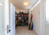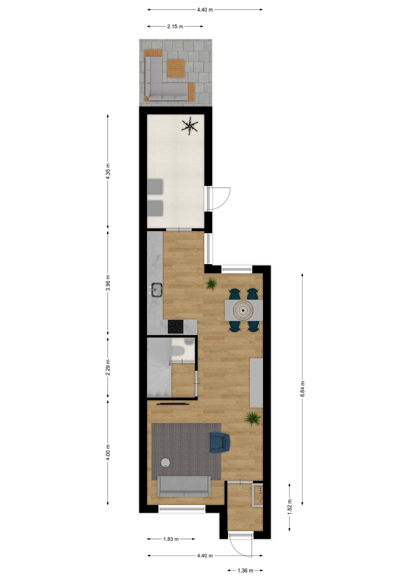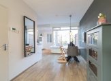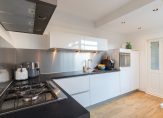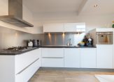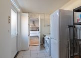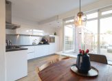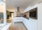 Hal/entree met garderoberuimte en meterkast. Lichte woonkamer met moderne open keuken (totaal ca. 36 m²) en inbouwapparatuur: gaskookplaat met afzuigkap, vaatwasser, koelkast en een combimagnetron. Vanuit de keuken loop je naar de ruime bijkeuken/berging van ca. 10 m² met witgoedaansluitingen en deur naar de tuin. In de tussenhal is een modern toiletruimte en trapopgang naar de 1e verdieping.