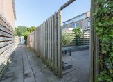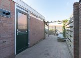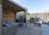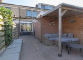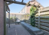 De besloten achtertuin ligt op het westen en heeft een achterom. Aan de bijkeuken/berging is een overkapping, waaronder je heerlijk beschut kunt zitten. Zowel de voor- als de achtertuin zijn verzorgd aangelegd.