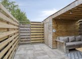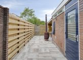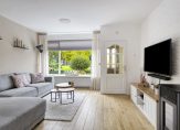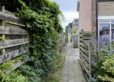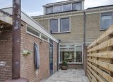 De besloten achtertuin met houten fietsenberging ligt op het zuidwesten en heeft een achterom. Aan de bijkeuken/berging is een overkapping, waaronder je heerlijk beschut kunt zitten. Zowel de voor- als de achtertuin zijn verzorgd aangelegd.