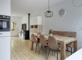 Entree/hal met garderoberuimte en meterkast. De ruime en lichte woonkamer is voorzien van een pelletkachel en een moderne open keuken (2021) met inbouwapparatuur: inductiekookplaat met afzuigkap, combimagnetron, vaatwasser en koel-/vriescombinatie. Vanuit de keuken is er toegang tot de praktische bijkeuken/berging met plaats voor wasmachine/droger, c.v.-opstelling en extra bergruimte. De woonkamer en keuken zijn samen ca. 36 m² groot. In de tussenhal met modern toiletruimte is de trapopgang naar de 1e verdieping.