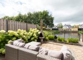 De zonnige tuin aan het water ligt op het zuidwesten en is verzorgd aangelegd. Naast de serre is een overkapping. Aan het water is een 2e terras. Vanwege de ligging is een royaal zonnescherm aanwezig boven de serre en overkapping, welke op zomerdagen voor schaduw kan zorgen.
