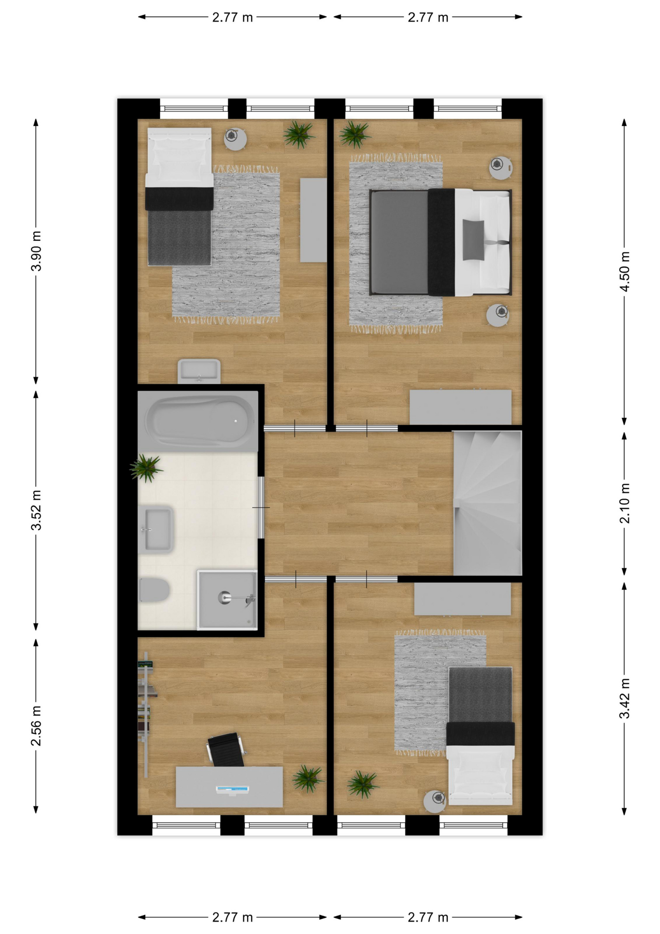 Ruime overloop, 4 slaapkamers van ca. 13, 11, 10 en 8 m² en een moderne badkamer met inloopdouche, wastafelmeubel, designradiator en 2e toilet.