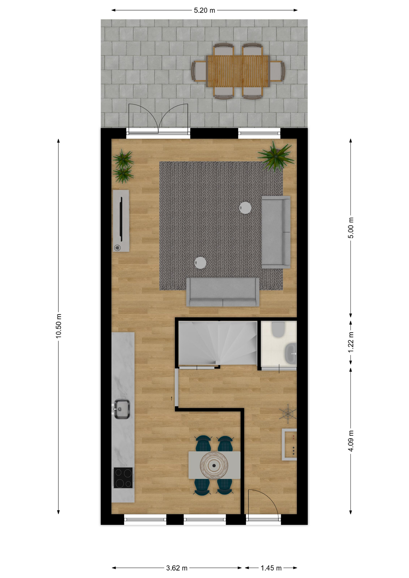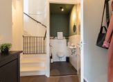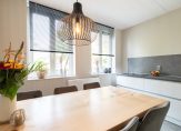 Entree/hal met meterkast en een modern toilet. Via de hal kom je in de lichte en uitgebouwde woonkamer met openslaande deuren naar de tuin. Vanuit de woonkamer kijk je uit over de diepe tuin, die op het zuiden ligt. Aan de straatzijde is de eethoek met de luxe open keuken voorzien van inbouwapparatuur: een koelkast, een vriezer, combi-magnetron, vaatwasser, een 4 pits kookplaat, Quooker en een Bora afzuiging. De woonkamer en keuken zijn samen ca. 41 m² groot en voorzien van een pvc vloer.