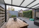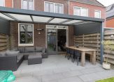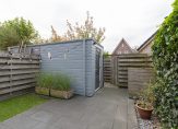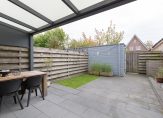 De tuin op het zuiden met achterom en een fijne overkapping aan huis is een fijne plek om gezellig met vrienden en familie te zitten en biedt genoeg ruimte voor kinderen om te spelen. Achter in de tuin is een houten berging voor de fietsen. Voor de woning zijn er voldoende parkeervakken voor je auto.
