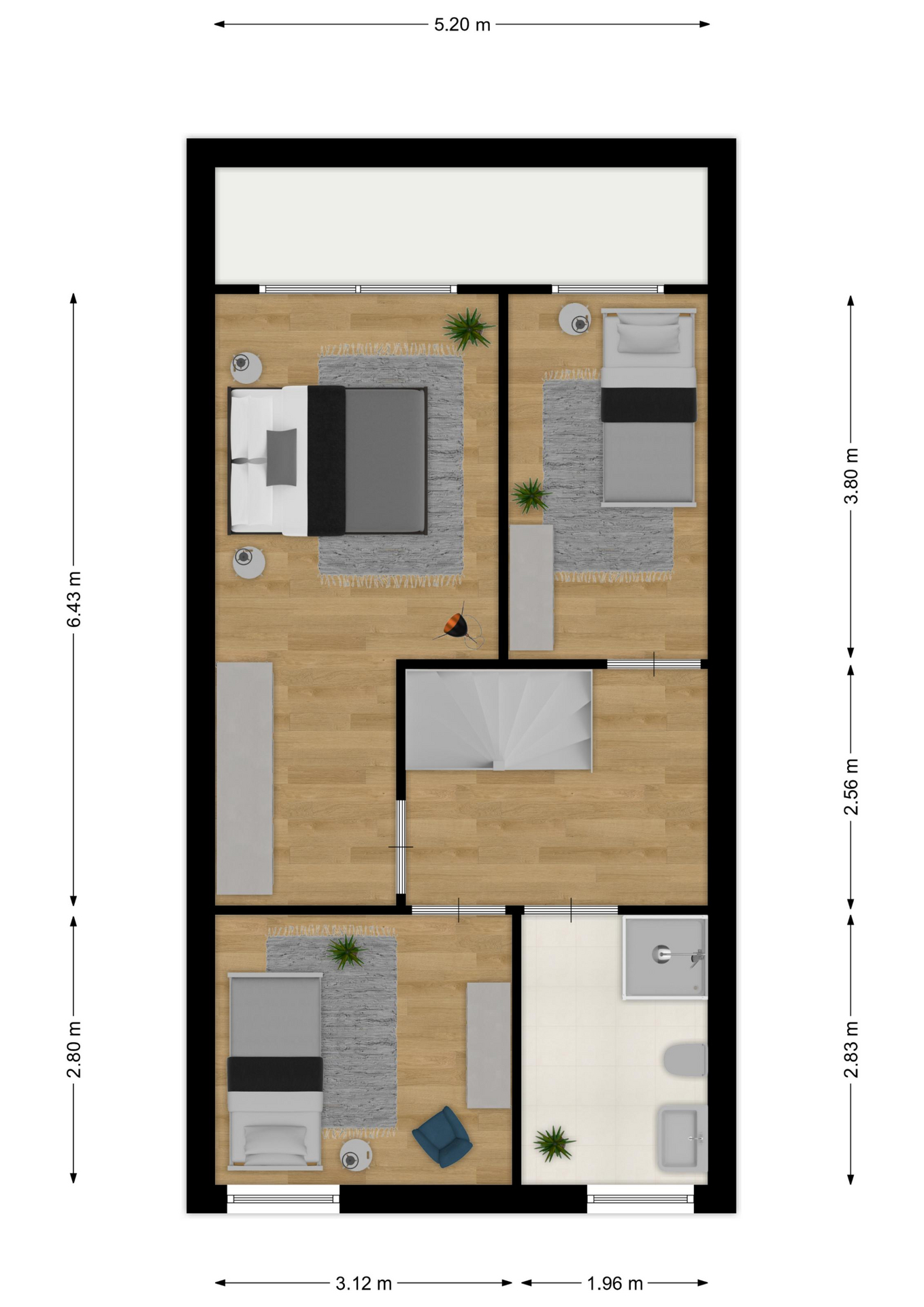 Overloop, 3 slaapkamers van ca. 17, 9 en 8 m² en een moderne badkamer met een inloopdouche, wastafel en 2e toilet.