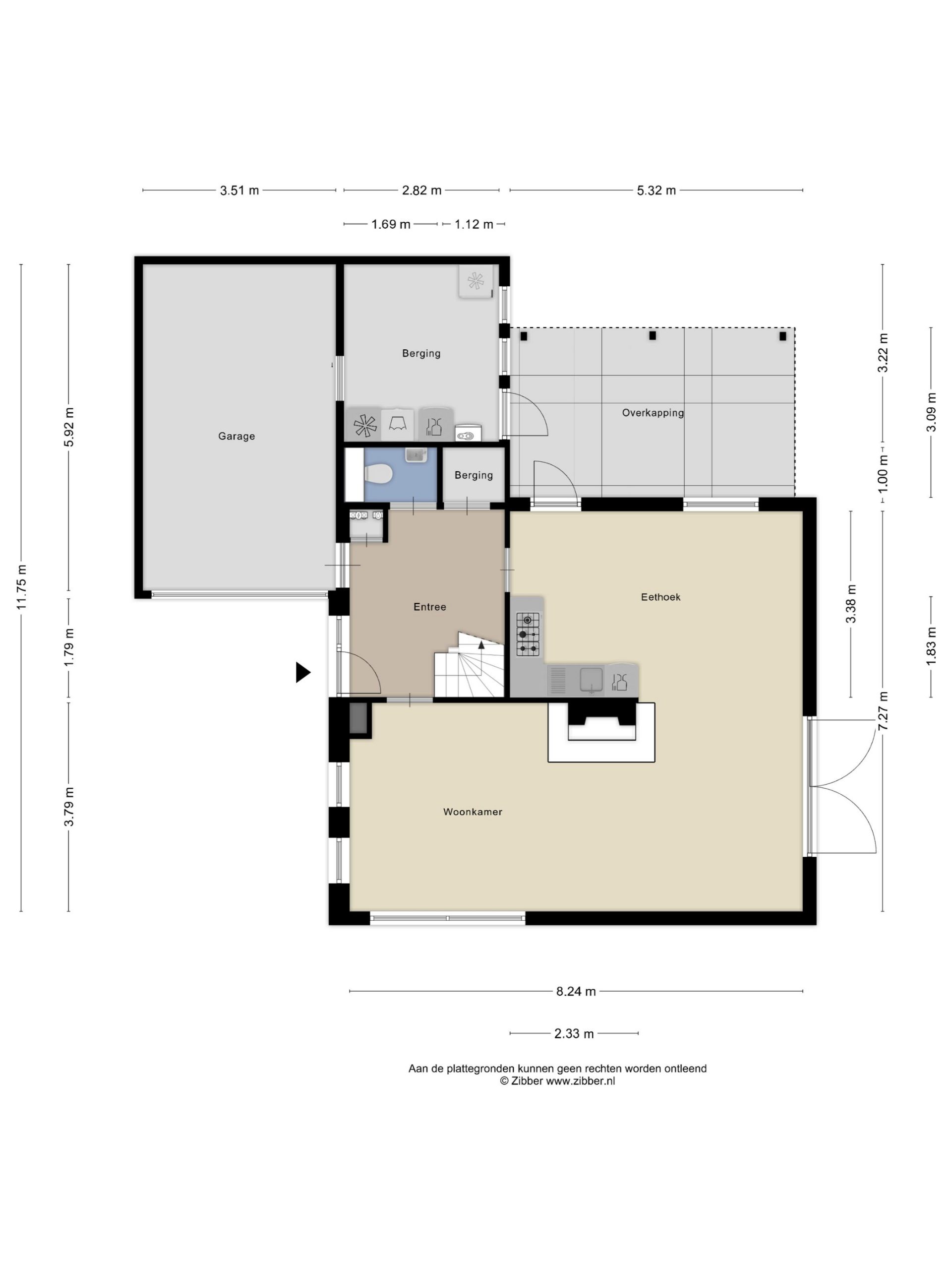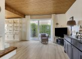 Royale entree/hal met meterkast, net toilet, technische ruimte en toegang tot de garage, keuken en woonkamer. De woonkamer met open haard is heerlijk licht door de raampartijen en de openslaande deuren naar de zijtuin. Aan de achterzijde is de keuken met eetgedeelte en deur naar het terras onder de overkapping en de tuin. De keuken is voorzien van nette keukeninrichting met inbouwapparatuur (5-pits gaskookplaat met afzuigkap, vaatwasser, koelkast en oven uit 2025). De woonkamer en keuken zijn samen ca. 49 m² groot. Via de garage van ca. 21 m² kom je in de bijkeuken/berging met witgoedaansluitingen, c.v.-opstelling en extra toegangsdeur naar de tuin.