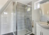 Overloop met vaste kast, 3 slaapkamers van ca. 13, 14 en 15.4 m², waarvan 1 toegang geeft tot het balkon, en een nette badkamer met douche, wastafel met meubel en 2e toilet.