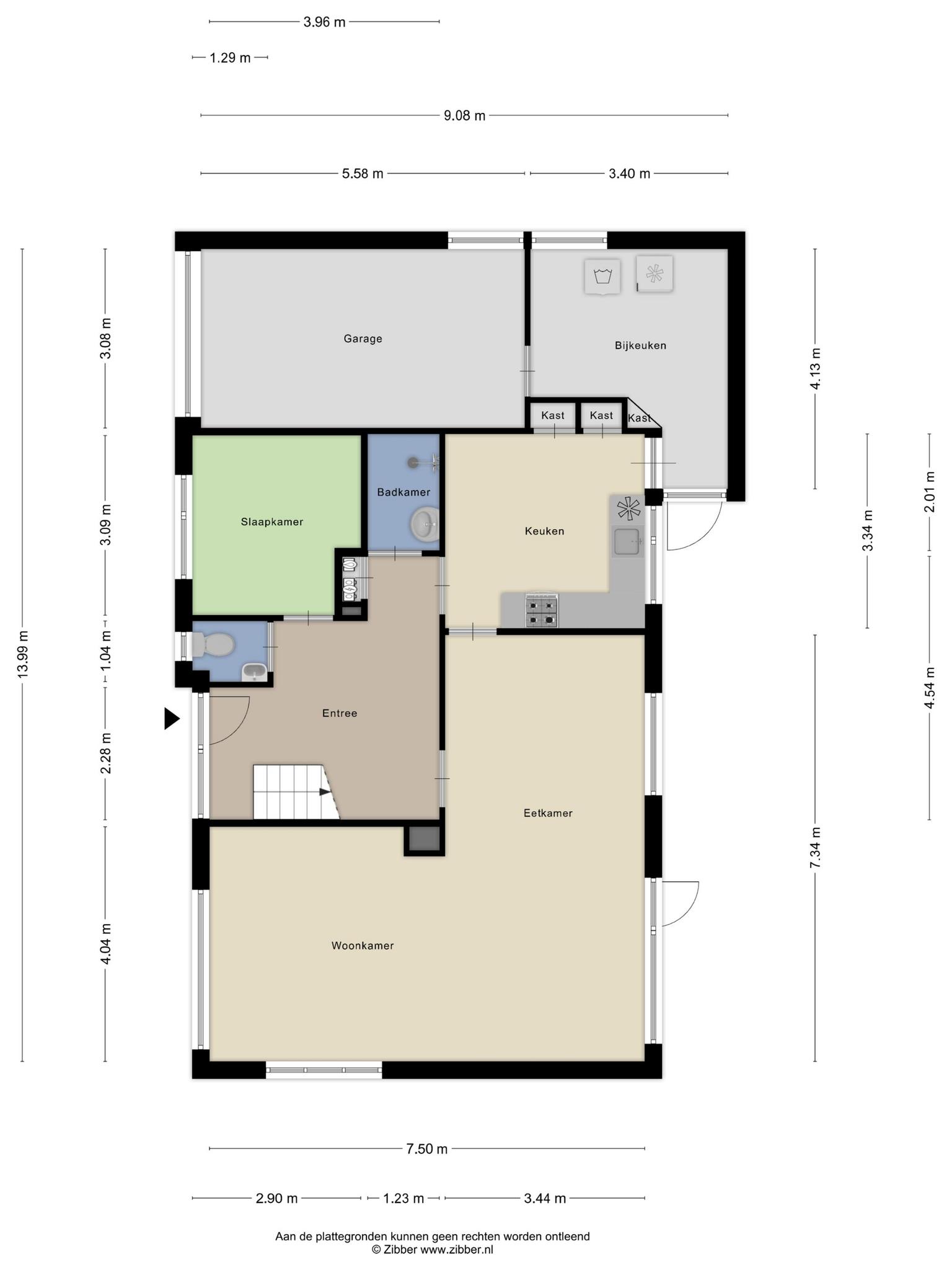 Ruime entree/hal, meterkast en toiletruimte, lichte woonkamer van ca. 42 m² met deur naar de tuin en veel raampartijen, woonkeuken van ca. 11 m² voorzien van een eenvoudige inrichting met inbouwapparatuur, bijkeuken met witgoedaansluitingen en deur naar de tuin.