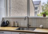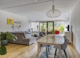 Entree/hal met meterkast, toiletruimte, garderoberuimte en toegang tot de bijkeuken/berging met bergzolder. De tuingerichte woonkamer van ca. 36 m² is voorzien van een grote raampartij met deur naar de tuin. De moderne open keuken (2021) van ca. 8 m² bevindt zich aan de voorzijde van het huis en is voorzien van een inductiekookplaat met afzuigkap, oven, vaatwasser, koelkast en een handige provisiekast.