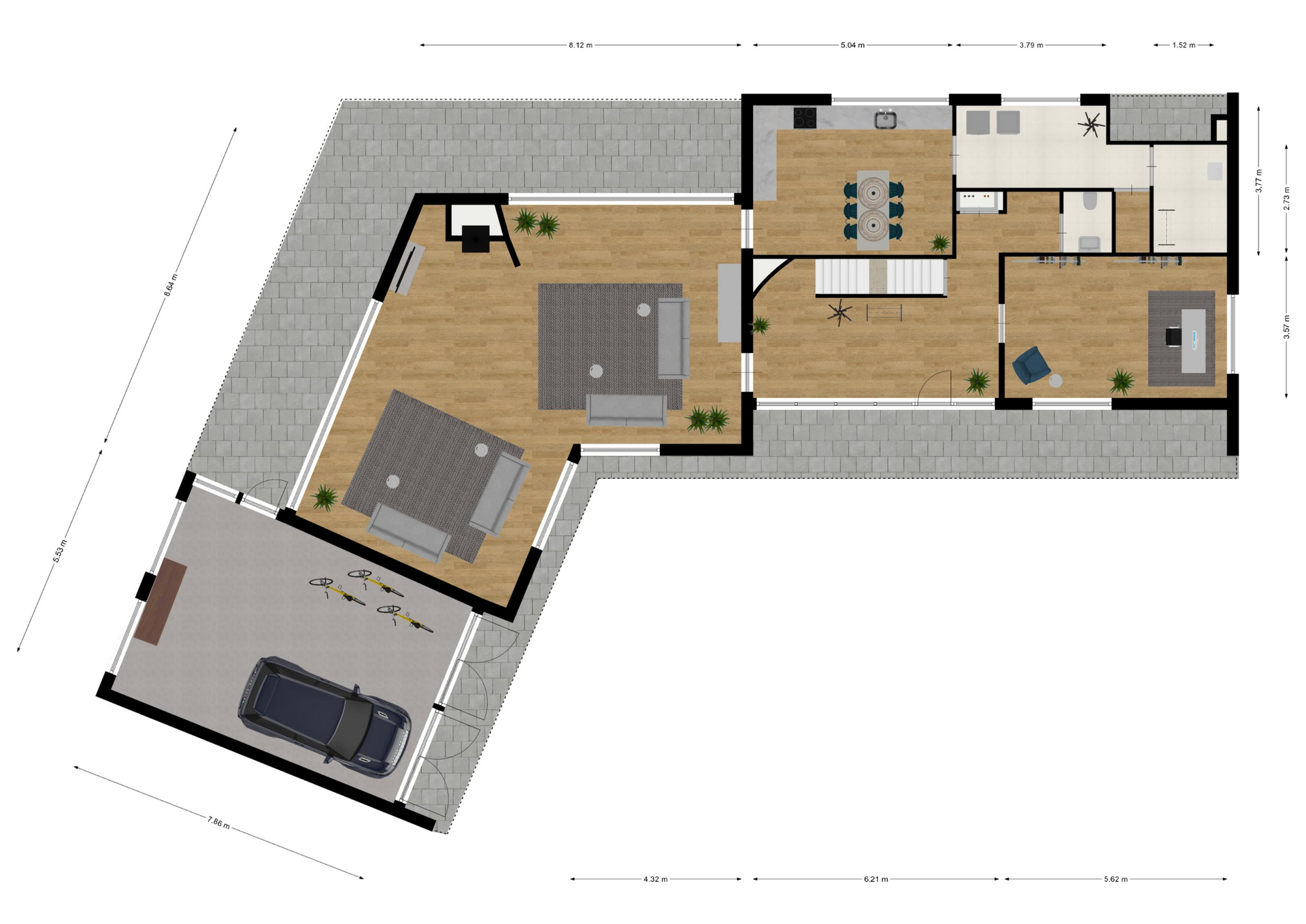 Ruime ontvangsthal van 25 m² met meterkast, garderoberuimte, net toilet en toegang tot de woonkamer/kantoor/slaapkamer van ca. 21 m². De royale en lichte woonkamer van ca. 75 m² is in afbouwfase en voorzien van 2 schuifpuien naar het terras en de tuin. Vanuit de woonkamer kom je in de woonkeuken van ca. 20 m², welke is voorzien van nette inrichting en inbouwapparatuur en deur naar de bijkeuken van ca. 11 m². De royale dubbele garage van 43 m² is van buitenaf bereikbaar.
