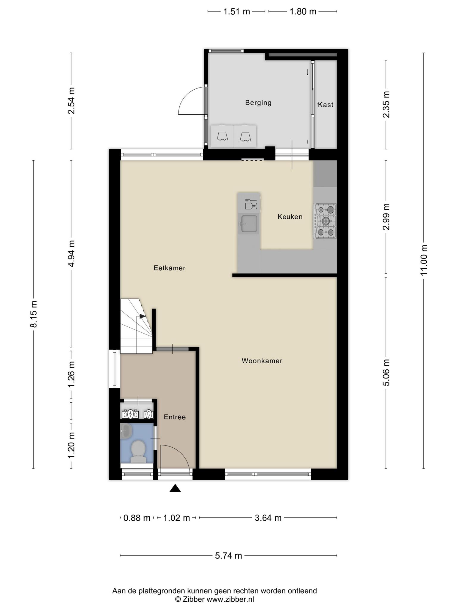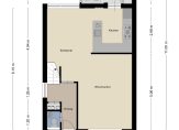 Entree/hal met toilet, meterkast en trap naar de 1e verdieping. Z-vormige woonkamer en een open keuken voorzien van inbouwapparatuur. De woonkamer en keuken zijn samen ca. 40 m² groot. Via de keuken loop je naar de bijkeuken met kastenwand en witgoedaansluitingen en deur naar de verzorgde achtertuin.