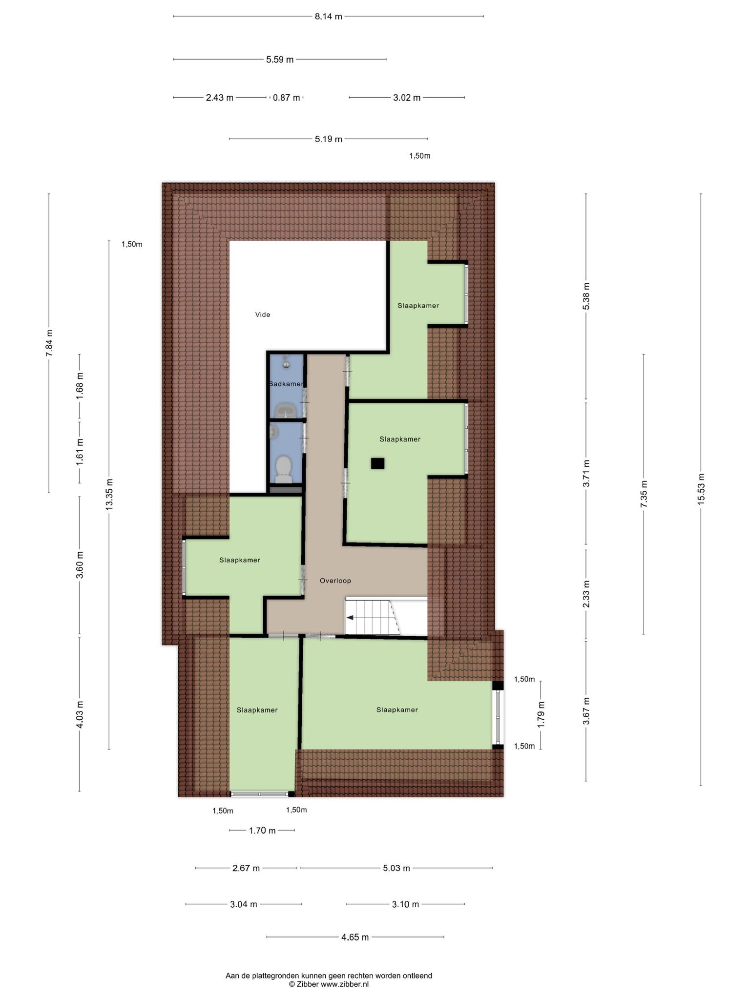 Overloop met gang, 5 slaapkamers van ca. 8, 10, 10, 11 en 12 m² (vloeroppervlakte), doucheruimte met wastafel en aparte toiletruimte.