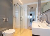 Overloop, drie slaapkamers van ca. 12, 10 en 6 m² en een moderne badkamer met inloopdouche, dubbele wastafel met meubel en tweede toilet.